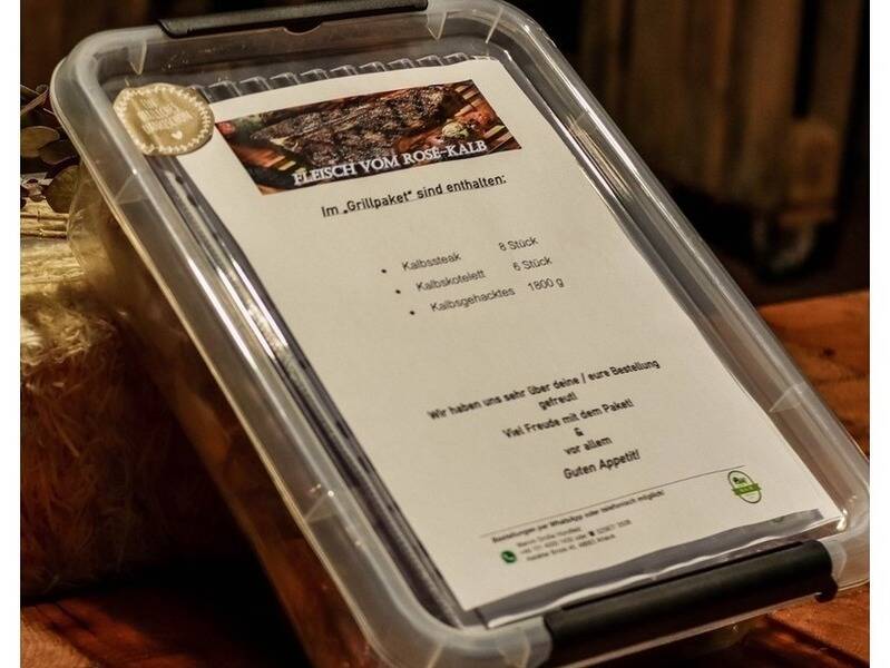 Die Fleischpakete, denen wir Nährwertangaben, Zubereitungstipps und Rezepte beifügen, sind für Sie vakuumiert, etikettiert und in wiederverwendbaren Kunststoffboxen auf unserem Hof abholbereit.